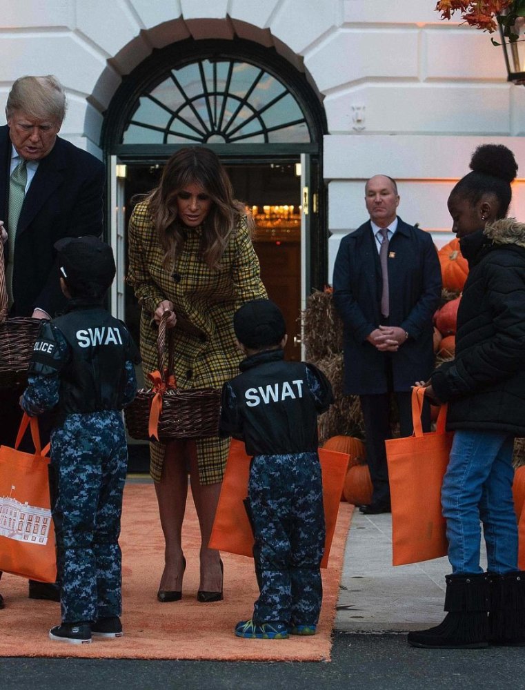 万圣节是西方的传统节日,其习俗之一就是孩子们打扮成各种奇异形象,挨家挨户敲门要糖果,大喊“不给糖就捣蛋”。虽然没人敢对总统夫妇搞什么恶作剧,但周日造访白宫的孩子们还是穿上了节日盛装,打扮成超级英雄、宇航员、特警队、骑士和公主,向特朗普和梅拉尼娅伸手要糖。特朗普看上去心情很好,在两个身穿埃及服饰的小姑娘上前时,他接过了孩子手里的玩具眼镜蛇“法老杖”,还假装念咒似的挥舞了两下,梅拉尼娅则在一旁笑了笑。