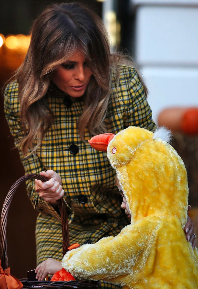 第一夫人当天身穿黄色格子外套和标志性的高跟鞋,拍了拍一只“小黄鸭”的脑袋,还拉了拉一只“小白兔”的长耳朵。总统夫妇跟所有的孩子合影留念,个别孩子在父母拍照之前就拿着糖跑了,总统还会屈尊把他们叫回来。